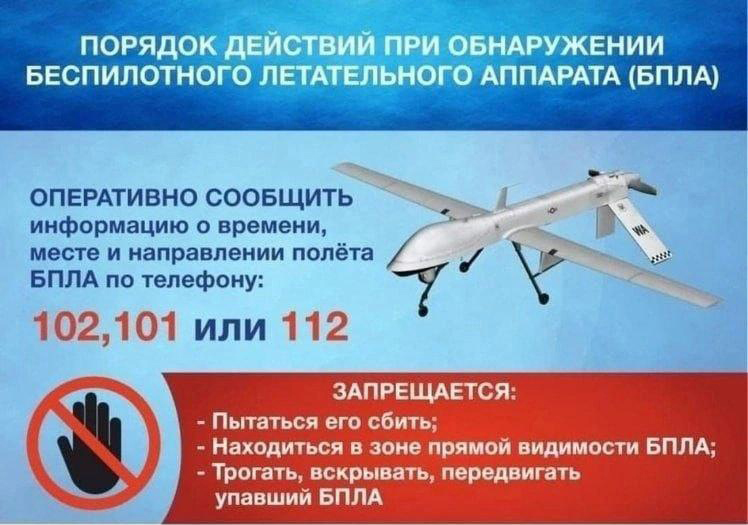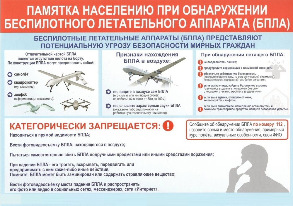 В случае обнаружения БПЛА необходимо по номеру телефона 102 или 112 сообщить место его нахождения.